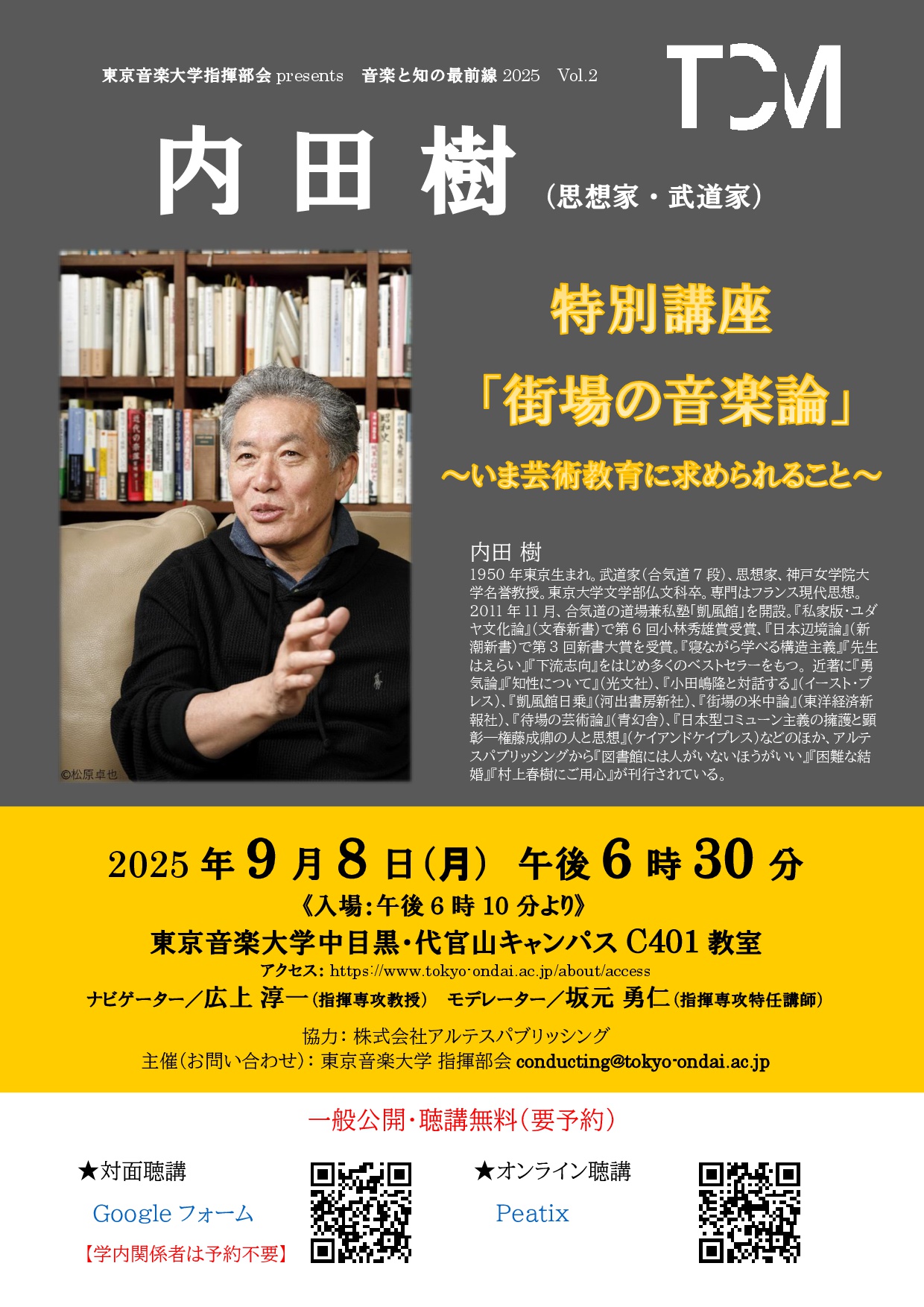 私、広上淳一だけではなく、私の数多くの音楽仲間たち、そしてここ東京音楽大学に集う学生、教職員も大きな「迷い」の中にいると感じています。ぜひとも内田樹先生のお話を通して、音楽大学が、音楽家が、人の世に奉仕するための指針を皆さんとともに考えていきたいと考えています。