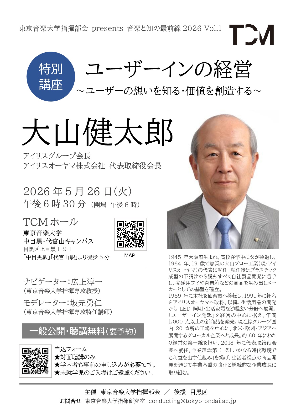さまざまなご苦労をされ、創意と工夫を重ねてアイリスオーヤマという前代未聞の世界に誇るメーカーベンダーを創りあげた大山健太郎会長。その手腕と不屈の精神、泉のように湧き出るアイデアの源泉、多くの部下・同僚・従業員に尊敬される人心掌握の術、人々を幸せに導いていくカリスマ的魅力の源は一体どこから生まれ出てくるのでしょうか。 東京音楽大学指揮部会が贈る「音楽と知の最前線2026」の第一弾はアイリスグループ 大山健太郎会長をお招きして、混迷と分断が深まり、世界が、私たちがこれまでに経験したことがないほどに秩序、制御、理性と愛を失い続ける現代社会において、アイリスオーヤマが創りあげてきた希望、一条の光の秘密をゆっくりと会長に紐解いていただきながら、「現代」をしたたかに生き抜くヒントを探ってゆきたいと思っています。